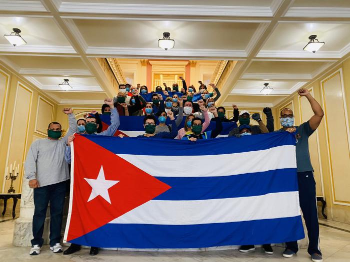 Conmueve, además, la foto divulgada por los diplomáticos de la Embajada de Cuba en ee. uu. Todos juntos, con el brazo izquierdo levantado, aguantando con fuerza una bandera cubana. Fue tomada en el recibidor del edificio que un día antes fuera blanco de un atentado terrorista.