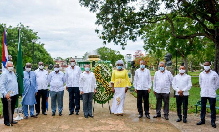 Sus palabras fueron ratificadas por Abel Coelho Mendoza, embajador de Guinea Bissau y decano del Grupo Africano del cuerpo diplomático acreditado en Cuba, quien exaltó, como un saludo natural, la llovizna sobre los bustos de los próceres que recibieron homenaje, con la colocación de una ofrenda floral.