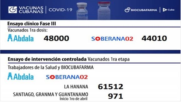 La intervención poblacional en La Habana incluyó al candidato vacunal Abdala, a partir del 1ro de abril, además de Soberana 02 y en las provincias orientales solamente se realiza con Soberana 02.