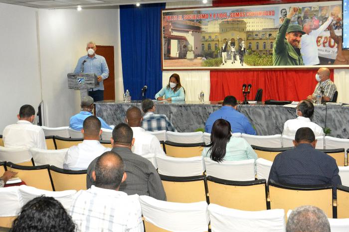 En la reunión de trabajo se reflexionó sobre el complejo entorno económico que vive el país, agravado por el bloqueo y las afectaciones que genera la covid-19; y se abordó la voluntad del Estado de salvar vidas, que tiene como expresión mayor los cinco candidatos vacunales cubanos que están en distintas fases de estudio.