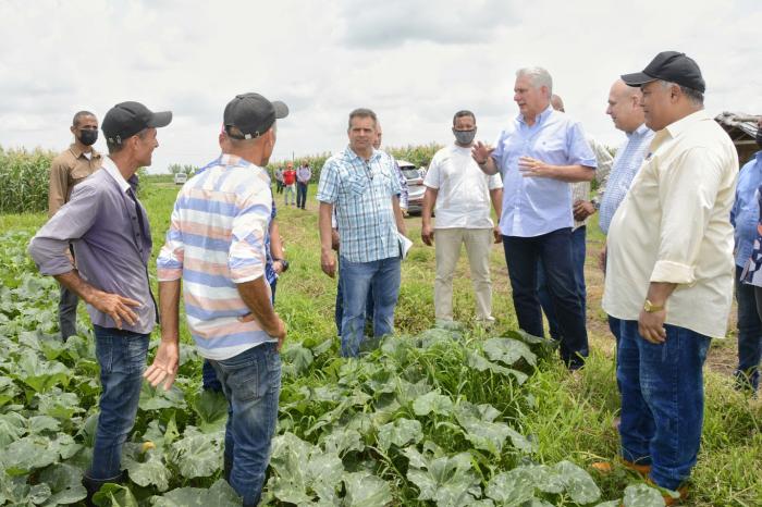 Durante la visita a Camagüey, Díaz-Canel llegó hasta el bloque productivo Santa Rosa, en Vertientes, ubicado en terrenos de la CCS Juan Manuel Márquez. Allí los hermanos Jesús y Leonardo Lezcano, junto a otros trabajadores agrícolas, fomentan cultivos varios como la yuca, el maíz y la calabaza en 161 hectáreas. En estos momentos, 72 están en cultivo. Esta es una estructura productiva que permite acercar los alimentos a las comunidades.
