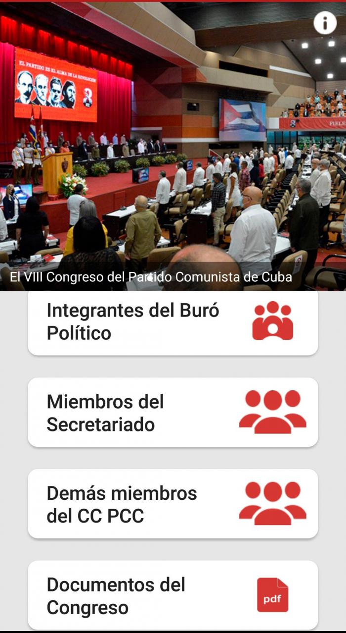 Una aplicación para móviles que contiene la información más relevante que trascendió durante el 8vo. Congreso del Partido Comunista de Cuba, ya está disponible en Apklis, el Centro Cubano de Aplicaciones Android. La apk incluye la relación de los integrantes del Buró Político, del Secretariado y demás miembros del Comité Central del PCC. En la actualidad, según datos ofrecidos por el Ministerio de Comunicaciones, más del 64 % de los cubanos acceden a internet y la telefonía móvil tiene 6,6 millones de usuarios. Esa amplia comunidad tendrá fácil acceso, de esta forma, a los documentos más trascendentales del Congreso, celebrado entre el 16 y el 19 de abril de este año. La convocatoria, el Informe Central, los discursos, así como las tesis y resoluciones emanadas de la cita partidista, podrán ser consultados en la plataforma.