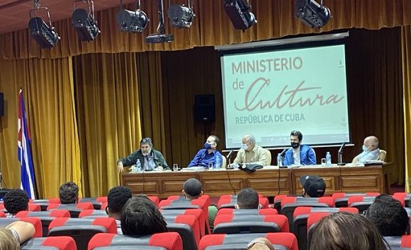 Participan en el encuentro el Ministro de Cultura, Alpidio Alonso; el viceministro Fernando Rojas; el presidente de Casa de las Américas, Abel Prieto; y el presidente de la UNEAC, Luis Morlote; y el presidente de la Asociación Hermanos Saíz, Rafael González.