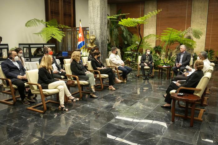 Durante el cordial intercambio, el mandatario cubano agradeció a los visitantes su permanente solidaridad con nuestro país ante las campañas de desinformación y la aplicación de dobles raseros, así como por la condena a la aplicación del bloqueo económico, comercial y financiero impuesto por el gobierno de Estados Unidos contra Cuba.