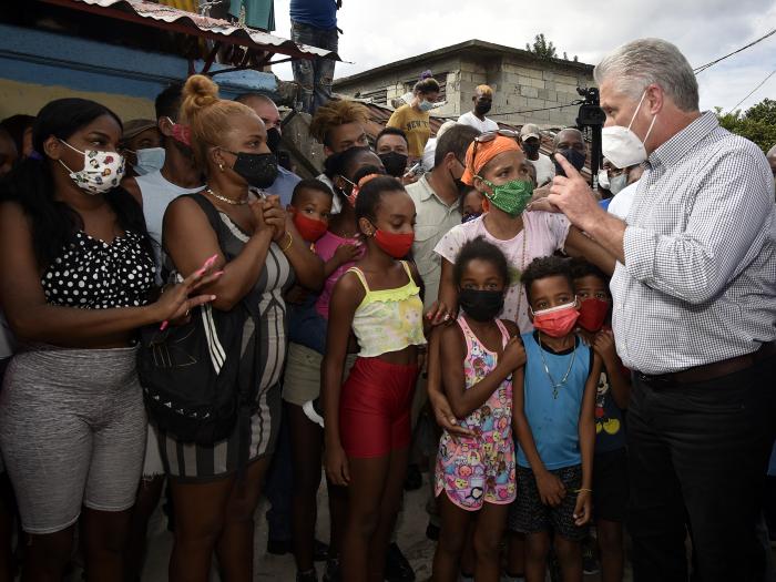 Díaz-Canel avanza, saluda, se hace fotos, sonríe, escucha... pide permiso para entrar a las viviendas. Los menos tímidos se acercan o lo llaman, quieren explicarle sobre cómo, poco a poco, han mejorado sus casas y el entorno, sobre cómo se ha contado con el barrio para priorizar las acciones de rehabilitación que se acometen en callejuelas y diferentes áreas de la comunidad.