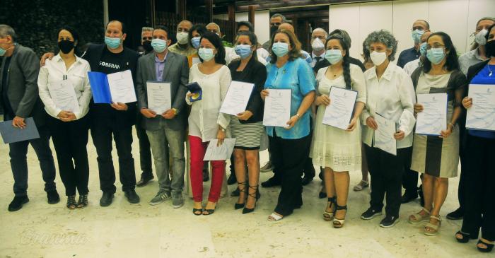 Ulises Guilarte de Nacimiento, miembro del Buró Político y secretario general de la CTC, y Jorge Luis Broche Lorenzo, miembro del Secretariado del Comité Central del Partido y jefe de su Departamento de Atención al Sector Social, acompañaron a los científicos en el momento del reconocimiento.